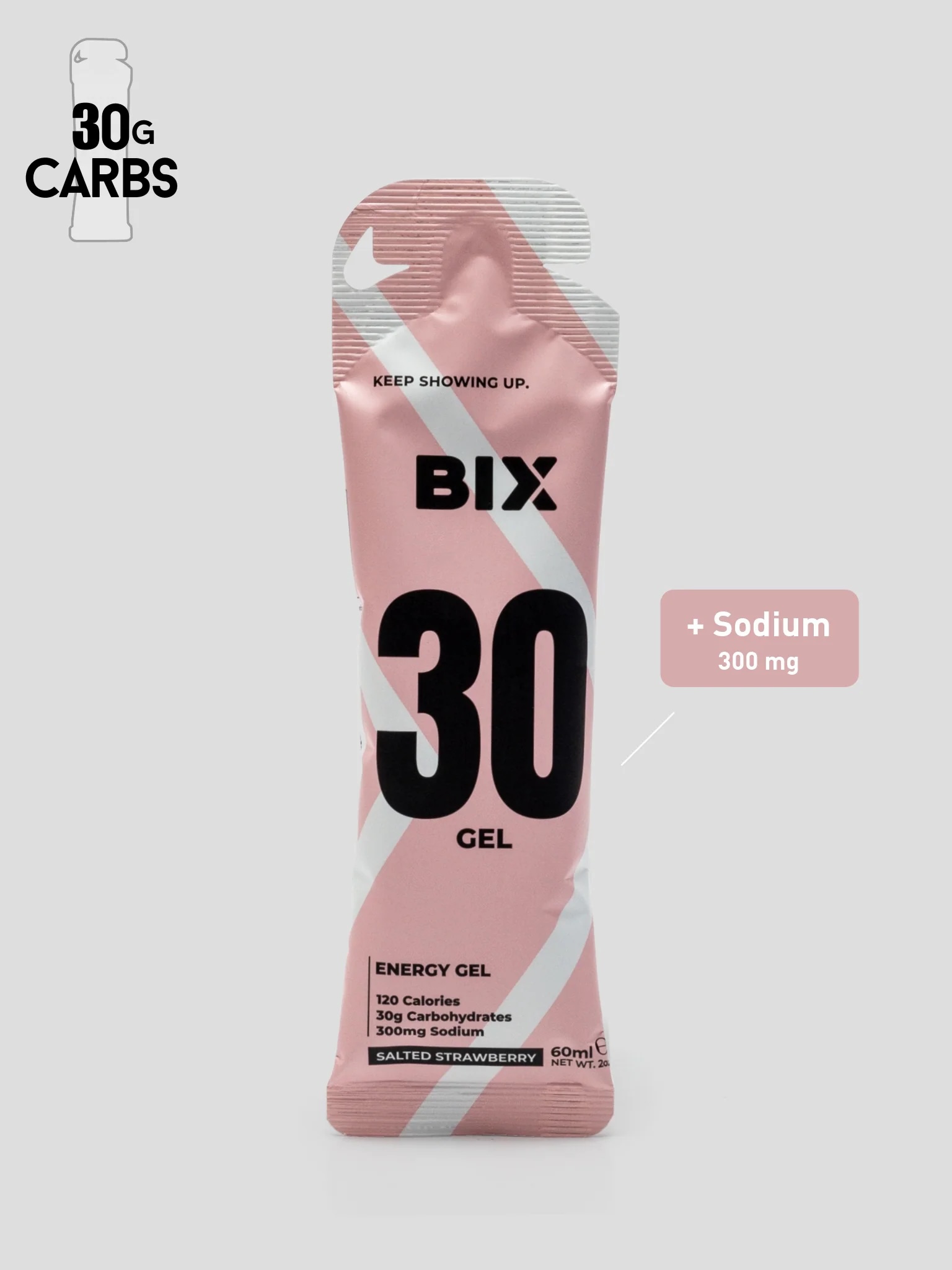 Introducing the Bix 30 Energy Gel – Salted Strawberry, your go-to fuel for high-performance training and racing. Each gel delivers 30 grams of carbohydrates and a powerful 300 mg of sodium to keep you energized and hydrated when it matters most.
